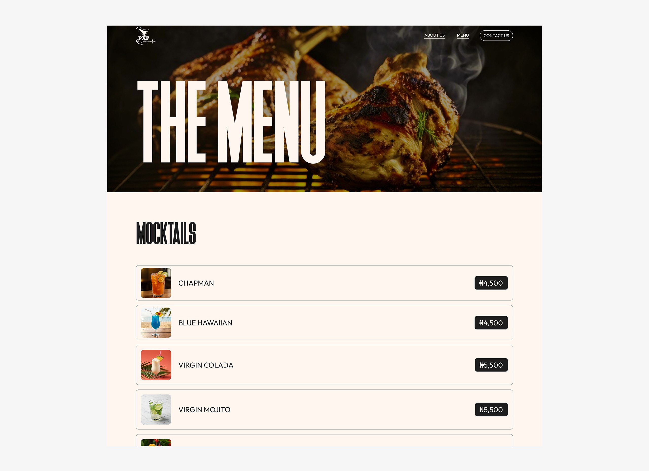 PXP Grillmates needed a modern way to serve customers beyond the traditional printed menu. The goal was to design a QR-enabled digital menu website that allowed customers to easily browse offerings directly from their phones, while also giving the brand a clean and premium digital presence.